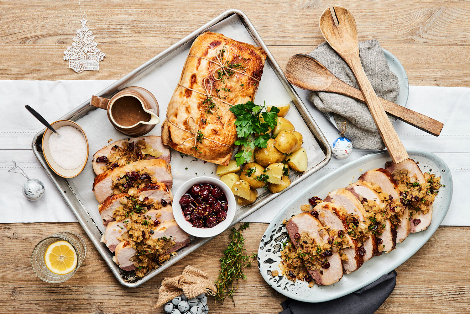 Free range Canter Valley cranberry and chestnut stuffed turkey, caramelized onion, sage and lemon gravy