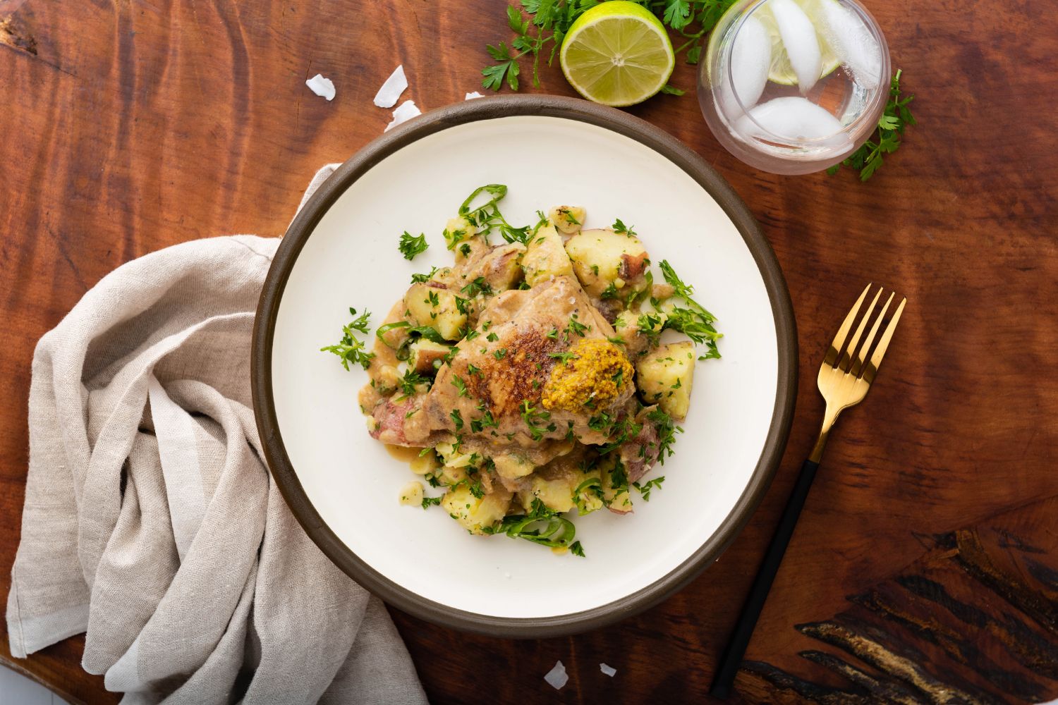 What the French don't know about flavour ain't worth knowing. Succulent chicken thigh baked in a Dijon mustard and creamy sauce served with baby herbed potatoes. Mouthwatering!