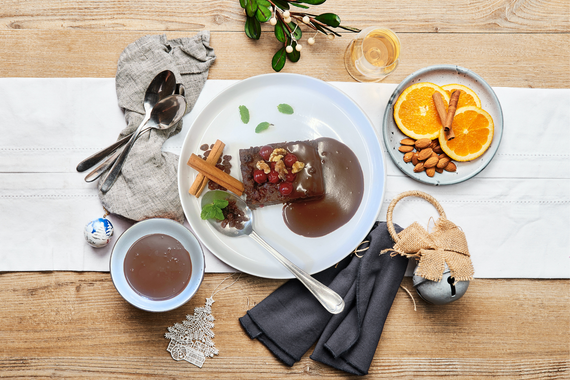 Hand made Christmas pudding loaf with chocolate sauce